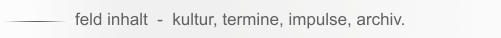 sitemap ............................. update in arbeit - under construction ● feld art - home .................... - kulturnachrichten (home page, news blog). ● feld inhalt - malerei ......... - event calendar, ..(exhibitions, culture, time line). - feld - arbeit, ........(project preparation). - feld - frucht, ........(project in progress). - feld - lager,......... (education, reflexion, ►archives ). ● feld galerie - bilderflut ......... - diaschau .............(painting & photo work in progress). ● feld versuch - thema ........... - inspiration, impulse, realisation, reference. - feld stationen - vita, ● feld kontakt - impressum .... - mail formular, legals, copyright.